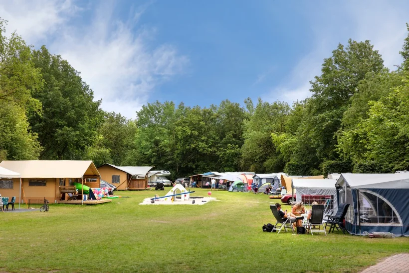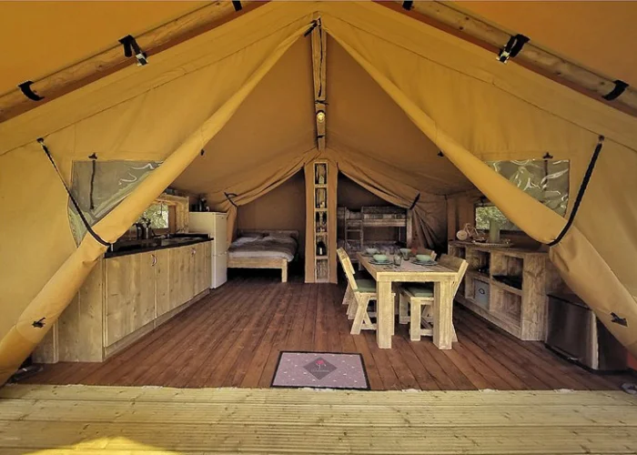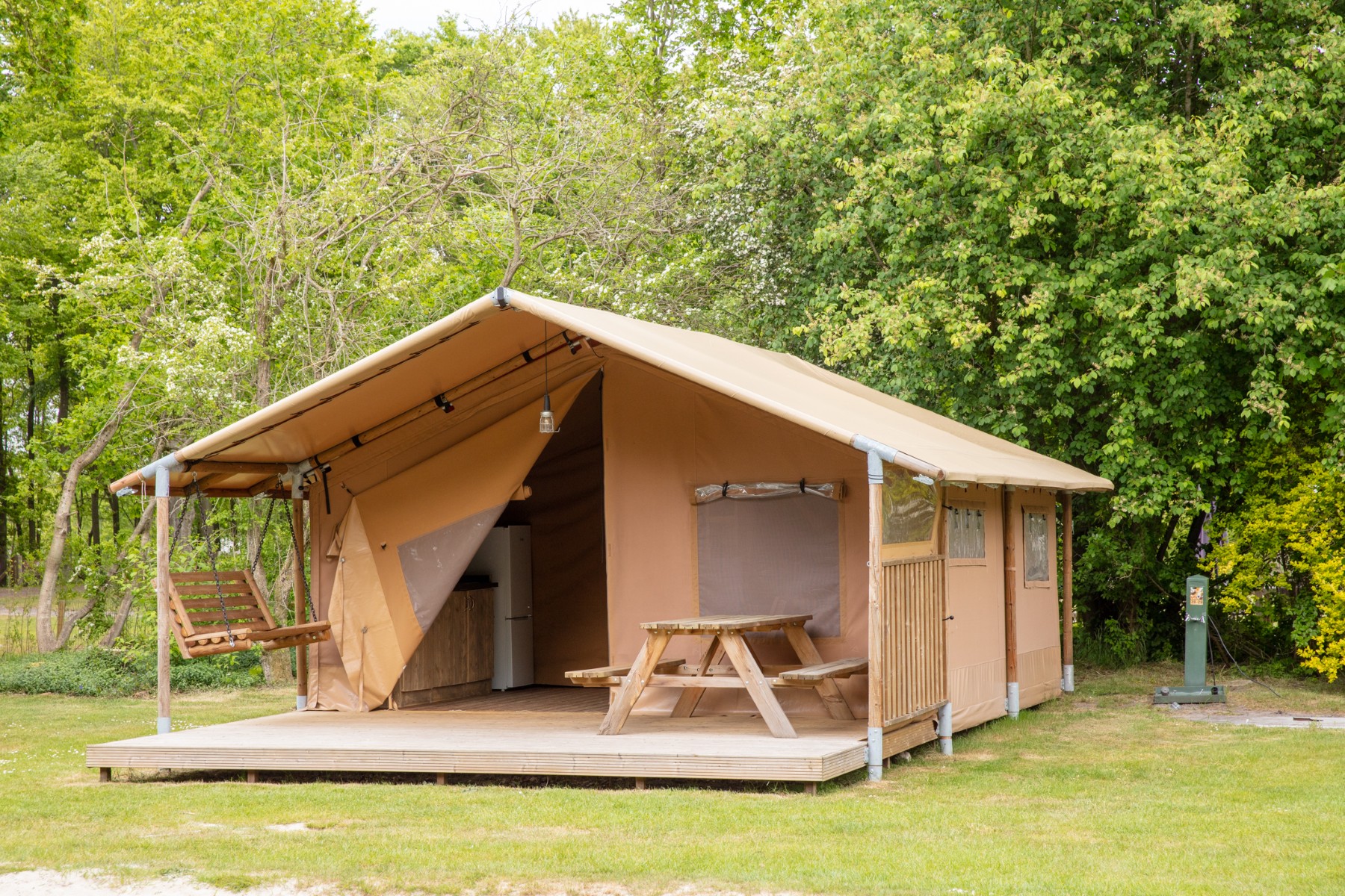 De safaritent heeft een overdekt terras met picknickbank en hangbank. Een heerlijk rustige plek om met een groep van 4 mensen op en top te genieten. Tijdens een verblijf in onze safaritent kom je helemaal tot rust. Komen de kleintjes mee? Pal voor de tent ligt een zandbak met speeltoestellen en een trampoline. In het hoogseizoen organiseert ons animatieteam allerlei leuke activiteiten voor kinderen.