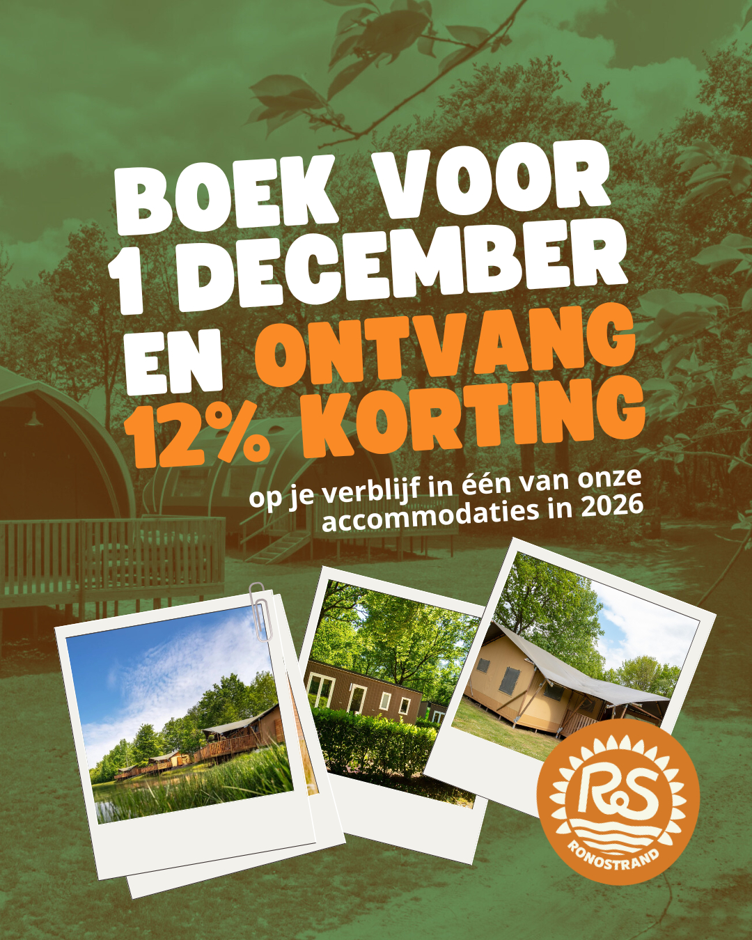 Plan alvast jouw moment van rust aan het Ronostrand en profiteer van deze fijne vroegboekkorting. Geniet van rust, natuur en gezelligheid met de mensen die voor jou het belangrijkst zijn. Boek vóór 1 december 2025 en ontvang 12% korting op één van onze verhuur accommodaties.